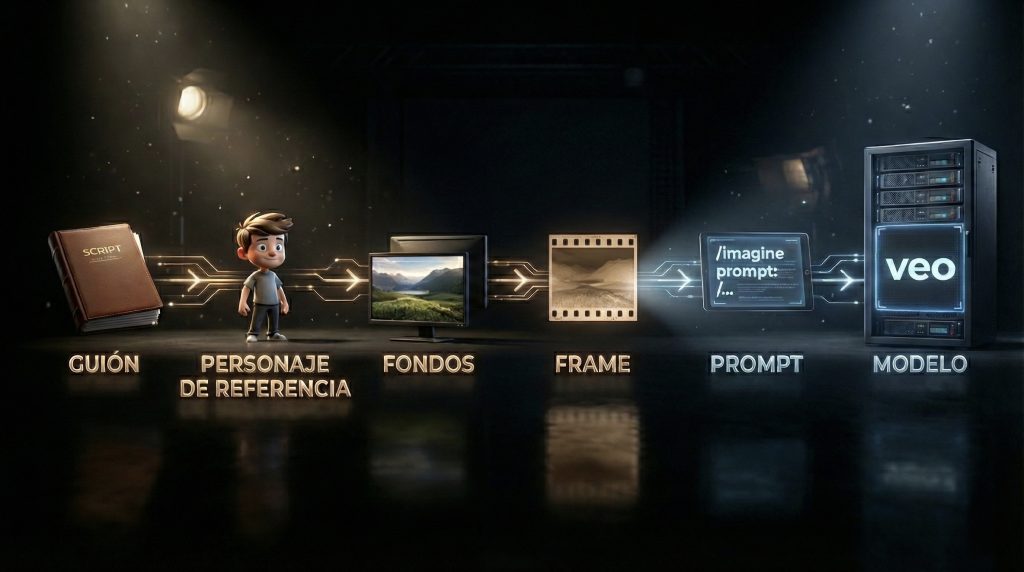 Imagina el flujo de trabajo que se ve en la imagen de referencia. Todo empieza con un guión o idea base. A partir de ahí defines un personaje de referencia para que la IA entienda quién aparece siempre en la escena.